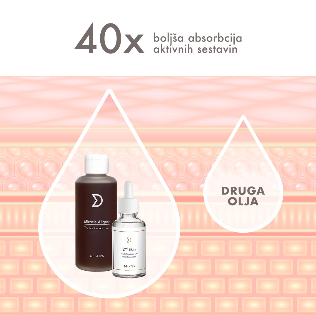 Delatis 2nd Skin je lahkotno, hitro vpijajoče, 100 % skvalan olje, pridobljeno iz skladkornega trsa, prilagojen potrebam vseh tipov kože. Mastno kožo uravnava, suhi koži pa dodaja potrebno maščobo, ki je biomimetična našemu sebumu.