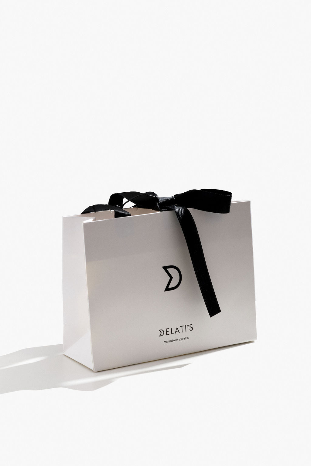 Kompaktna darilna vrečka je narejena iz papirja. Krasi jo minimalističen obojestranski potisk v lak črni barvi. Ročaji in sredinski trak, ki se zaveže, so iz tkanine.